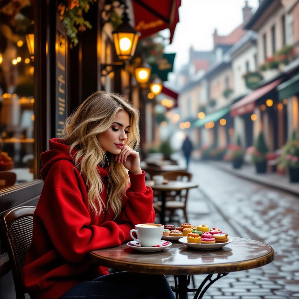 This image shows a solitary woman in a red hoodie at a cafe. The scene is rendered with muted, earthy colors, visible brushstrokes, and soft textures, capturing a serene, impressionistic autumn atmosphere.