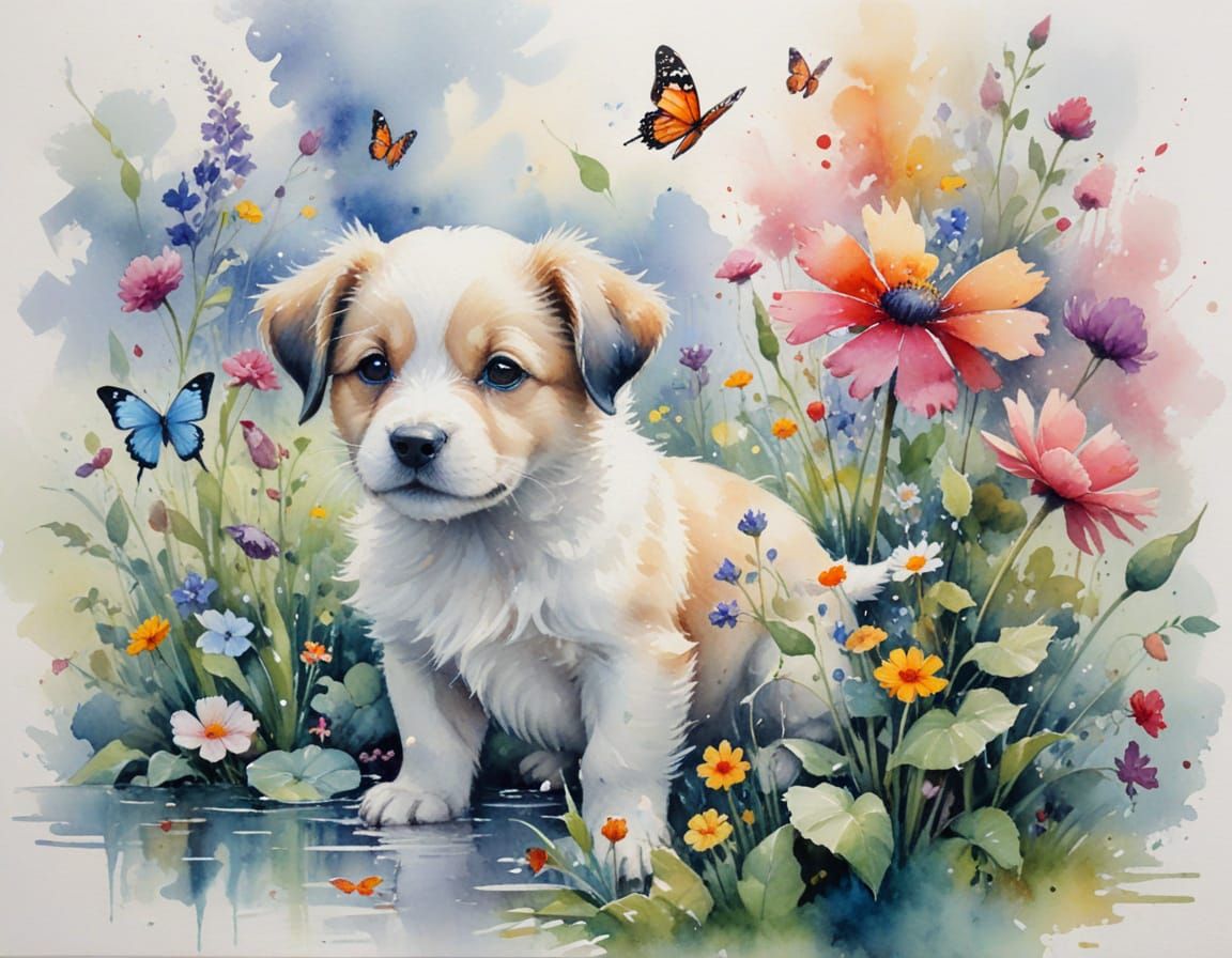 A whimsical watercolor painting of puppies near a pond. The idyllic scene features a magical garden filled with flowers and butterflies, rendered with delicate, expressive techniques in a cinematic style.