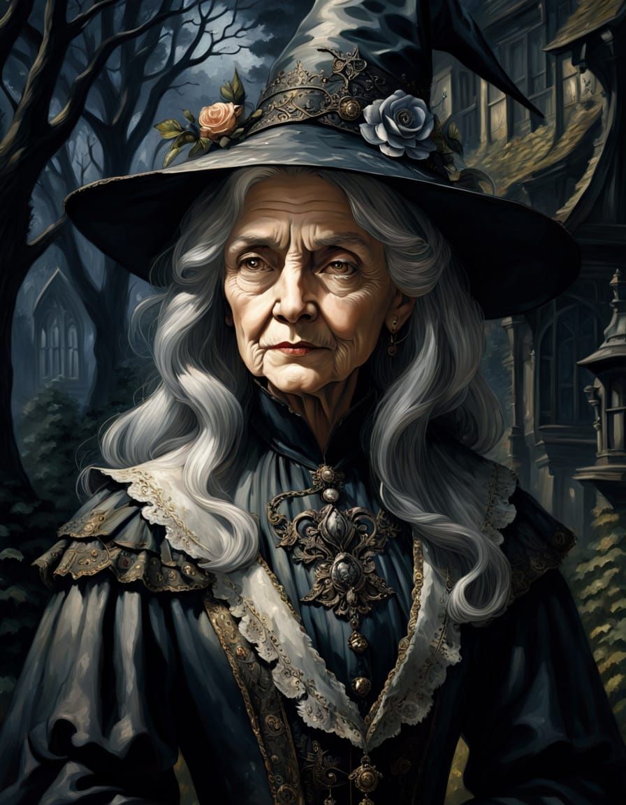 This image depicts an elder witch in a Victorian dress and tall hat, standing before a quirky cottage. Evocative brushstrokes and dramatic lighting create a gothic, fantasy art style.