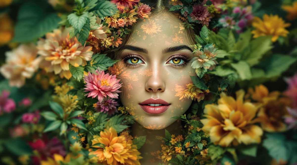 This enchanting portrait captures a serene woman surrounded by a lush, exotic garden, evoking a sense of whimsy and dreamlike wonder. Warm golden light and intricate textures create a mystical atmosphere, while vibrant blooms add a pop of color against her soft expression.
