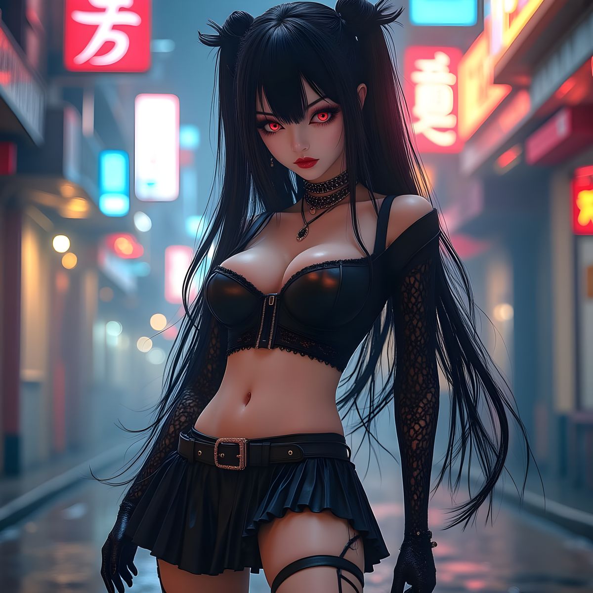 A striking image of a curvy anime assassin model with pigtails, a short skirt, long socks, and a low-cut crop top, rendered in a dark portrait style.