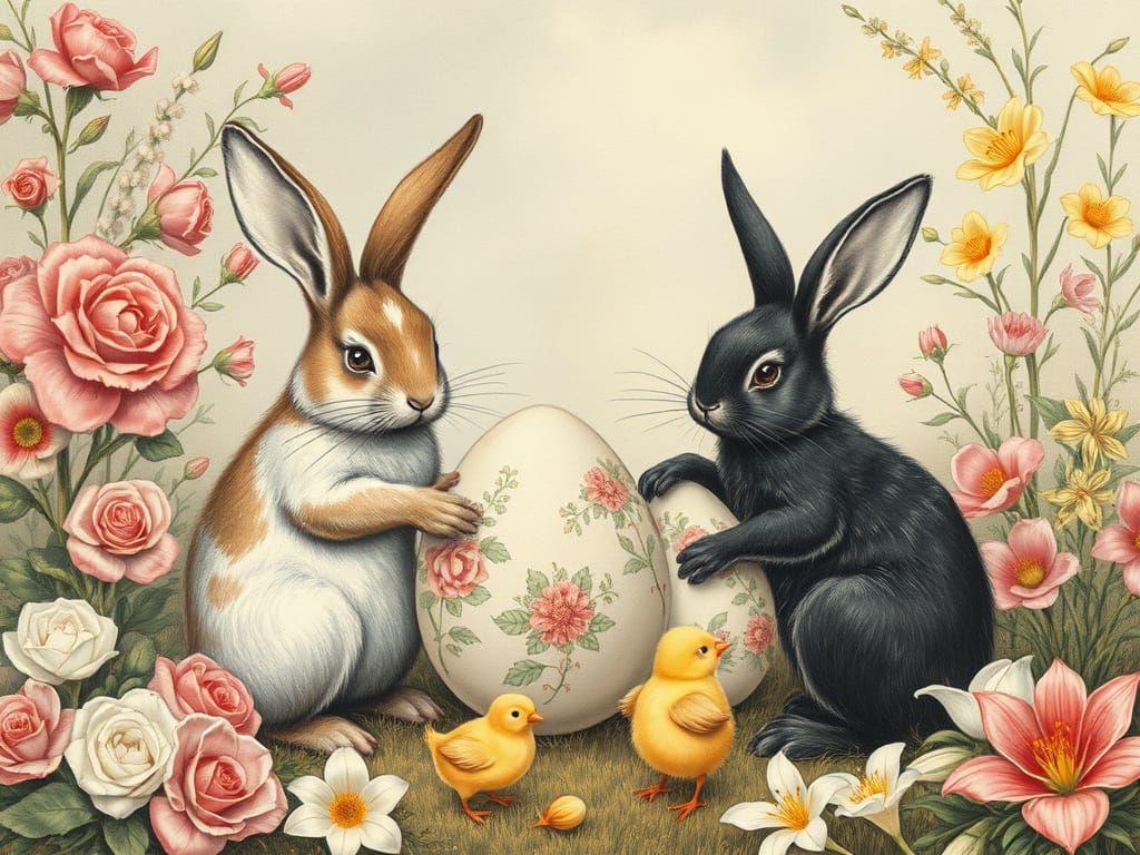 A vintage charcoal drawing of two bunnies and two chicks painting Easter eggs with floral designs. The whimsical landscape features vibrant flora, roses, lilies and gladiolus.