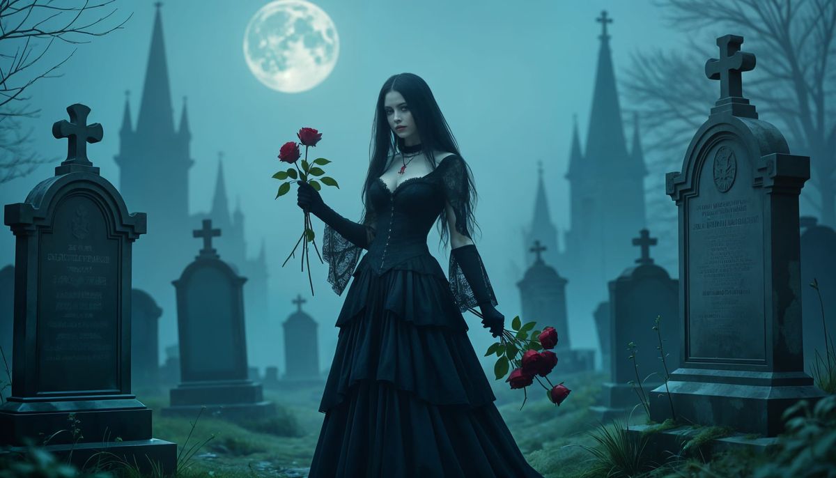 A lone Goth girl in a misty, moonlit graveyard clutches withered roses. The scene evokes a hauntingly beautiful, melancholic atmosphere with gothic architecture and ethereal glow, like a classic Victorian painting.