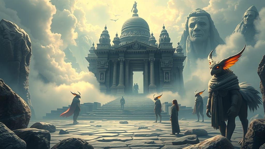 A majestic temple rises from an otherworldly mist, surrounded by fantastical items and phantasmal characters, as chimera creatures watch over the scene in a richly detailed matte painting with deep colors and intricate details.