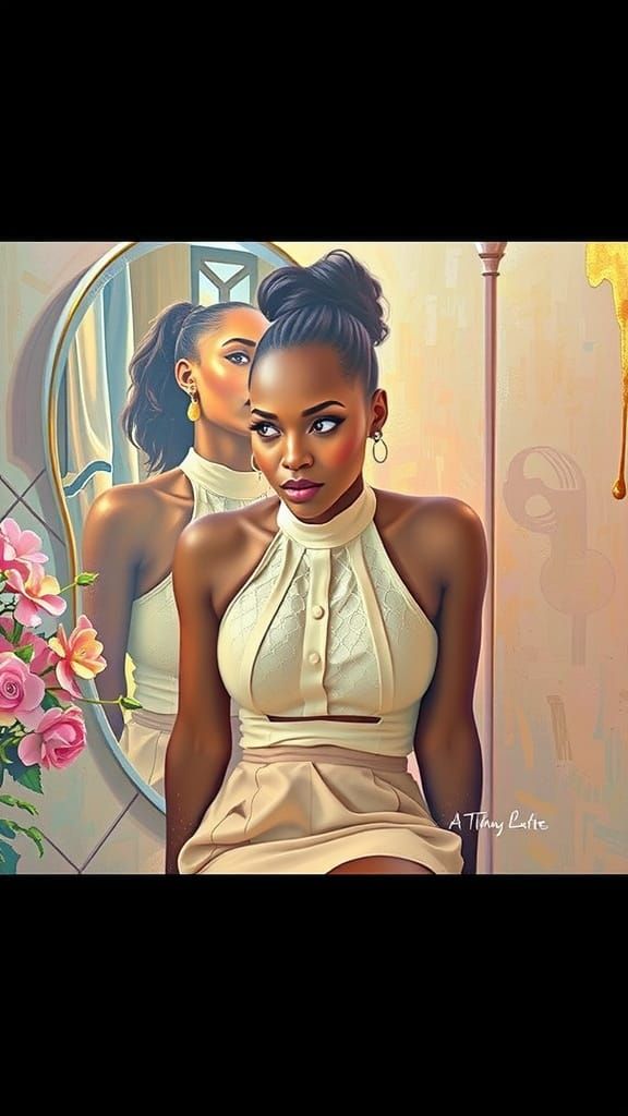 This image shows a photorealistic portrait of a woman with dark skin and hair, wearing a textured cream top. A mirror reflects her back, and pink and red flowers add color to the scene.