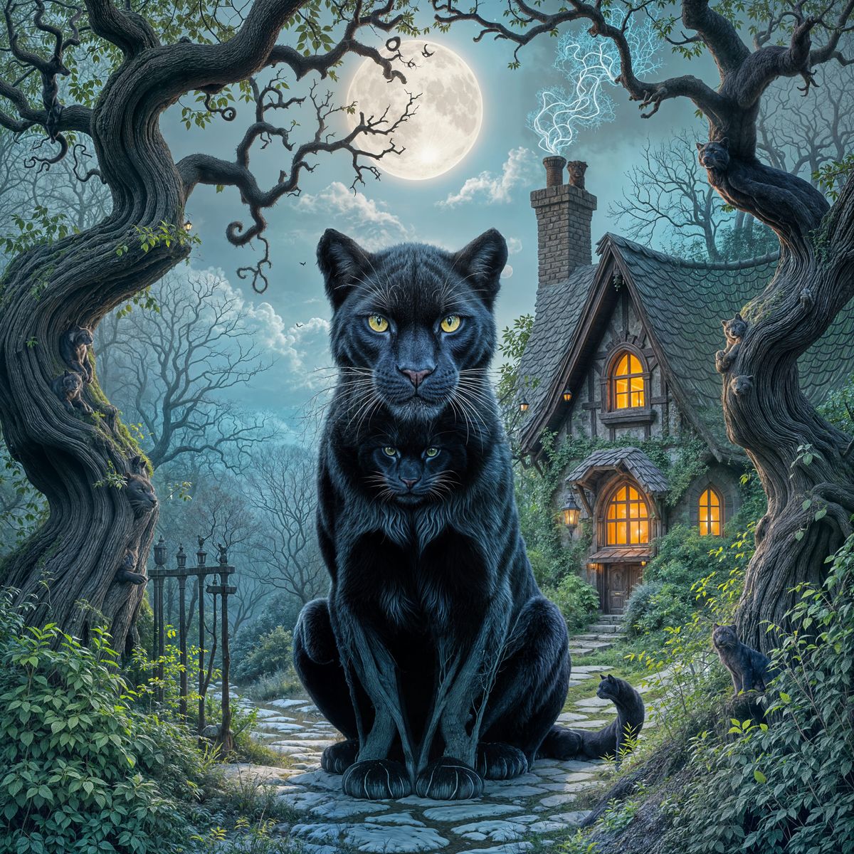 A captivating image of a black panther guarding a quaint cottage in an enchanted forest. Soft moonlight and whimsical blue smoke enhance the scene's mystery, reminiscent of classic fantasy art.
