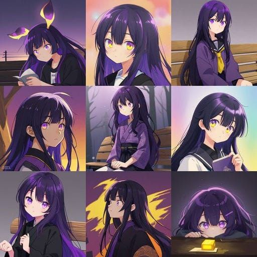 This image features a young African American college girl with long hair, dressed in a striking black and purple flannel outfit, rendered in a vibrant, manga-inspired style with cinematic lighting and deep colors.