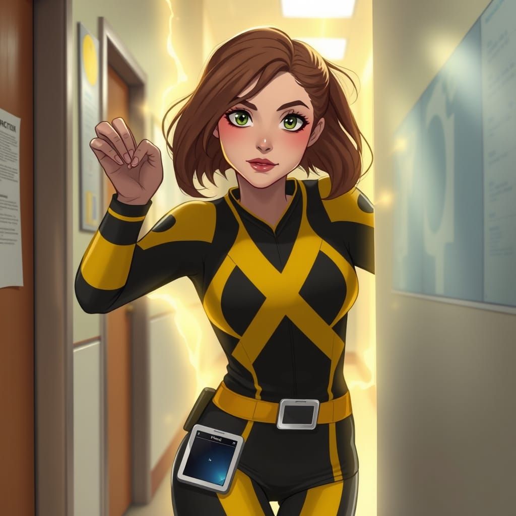This image shows Kitty Pryde phasing through a wall in a school hallway. She wears a black and yellow uniform and has a digital tablet on her belt. The image has soft realism and cinematic lighting.
