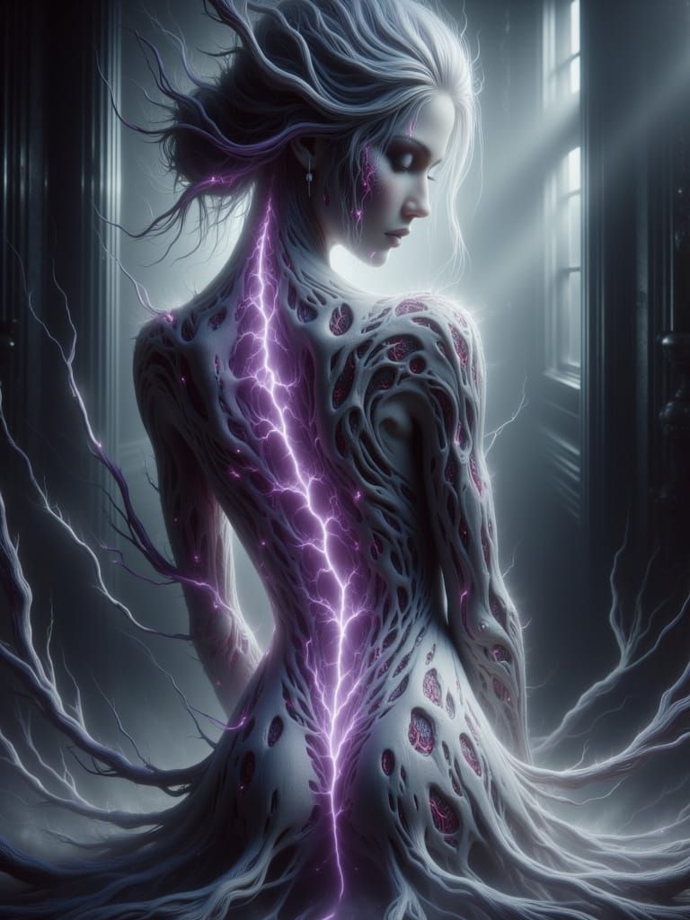 A delicate, fine art-style digital painting of a woman in a moment of quiet sorrow, her skin cracked with subtle intensity, set against a muted, softly lit background with warm, cinematic tones.