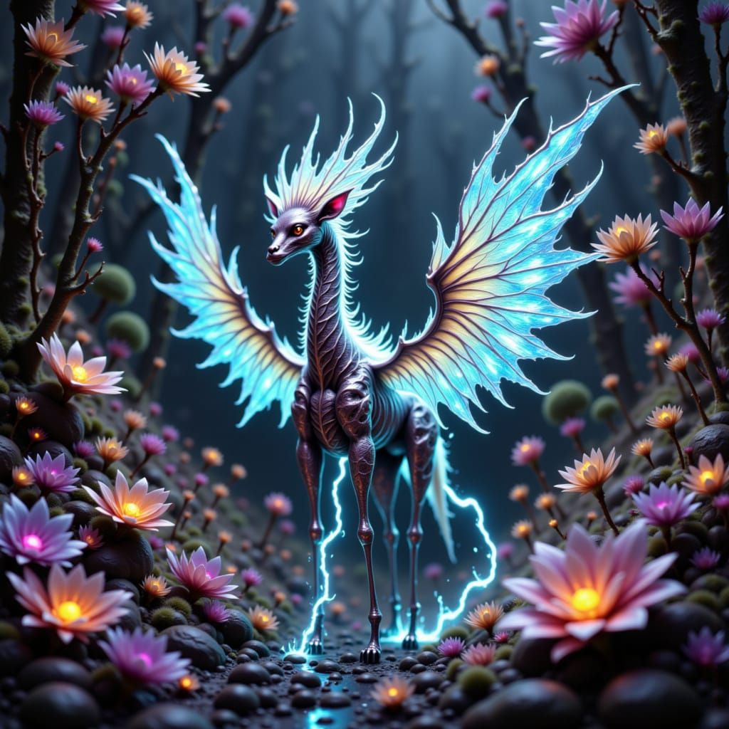 This image shows a fantastical hybrid creature, part gryphon, giraffe, and insect, emitting lightning in a glowing alien forest. Rendered in vivid 3D digital art with cinematic lighting.