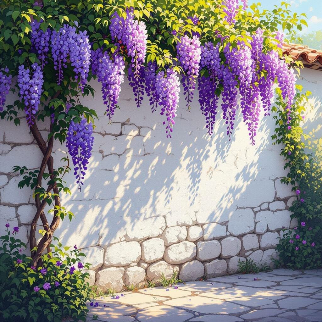 A tranquil image shows a stone wall adorned with wisteria. Sunlight filters through the leaves, creating dappled shadows in a painterly style, reminiscent of romantic art.