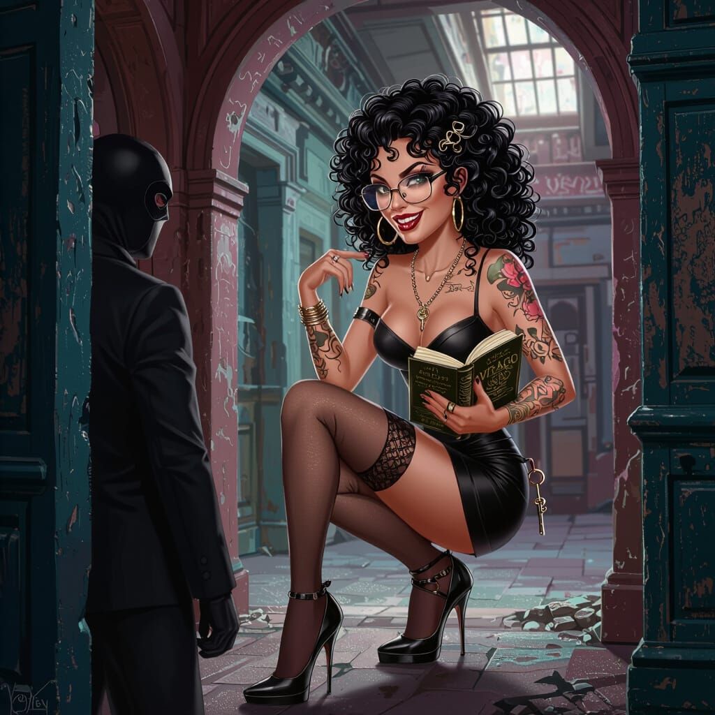 This image shows an enticing Hispanic woman with tattoos and glasses in an abandoned urban building. Rendered in a detailed matte painting style with deep, complementary colors.