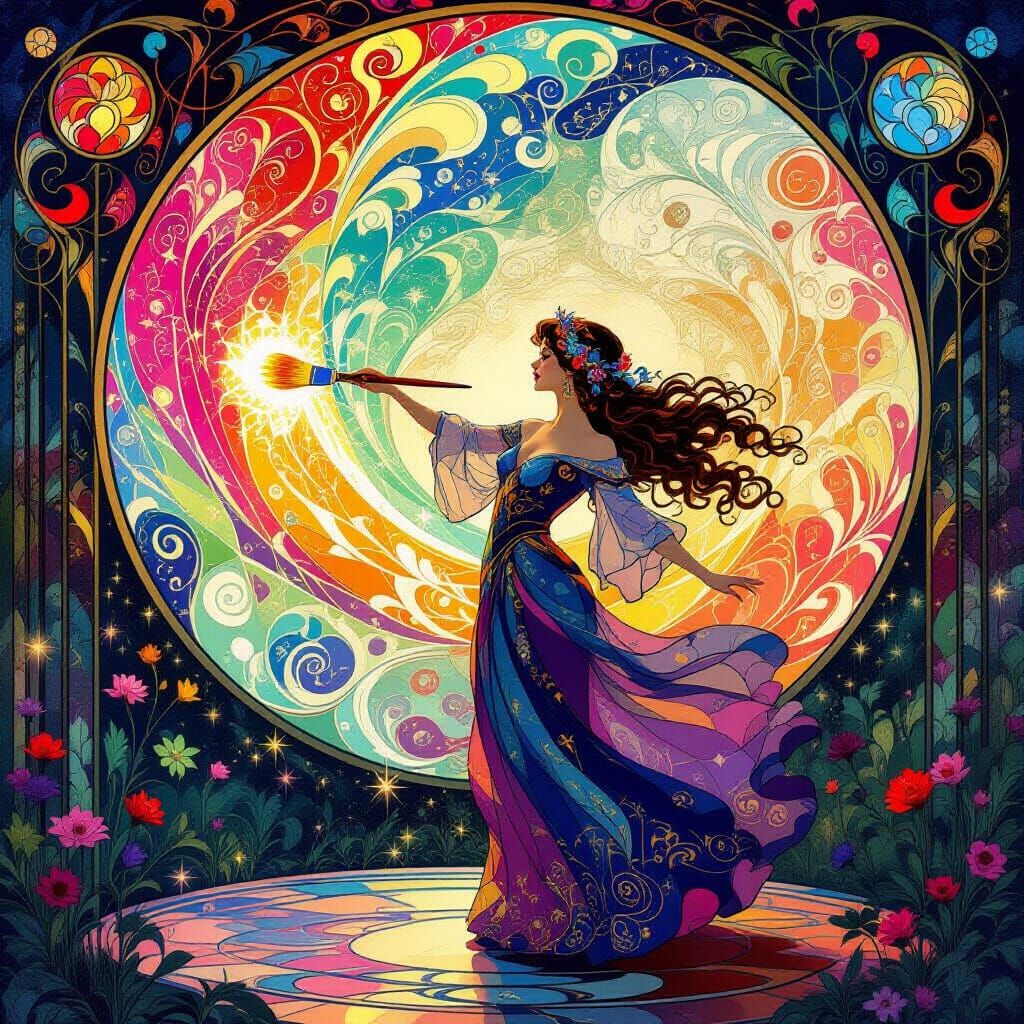 This image shows a magical painter creating vibrant, glowing artwork with an enchanted brush. The scene features intricate patterns and flowing lines in a luminous art nouveau style.