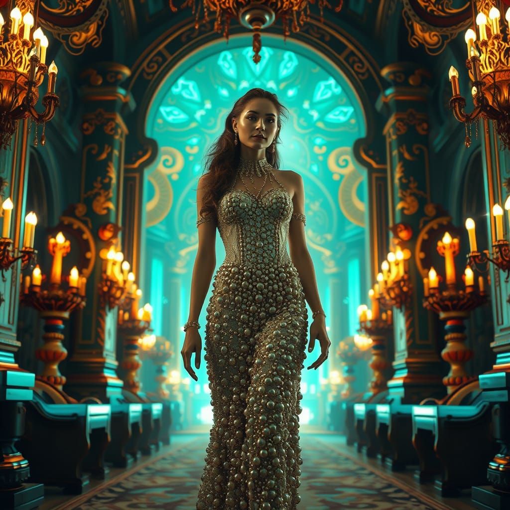 This image shows a woman in a beaded dress within an ornate, luxurious environment. The scene evokes fantastical realism with futuristic and cyberpunk elements, featuring intricate textures and dramatic lighting.