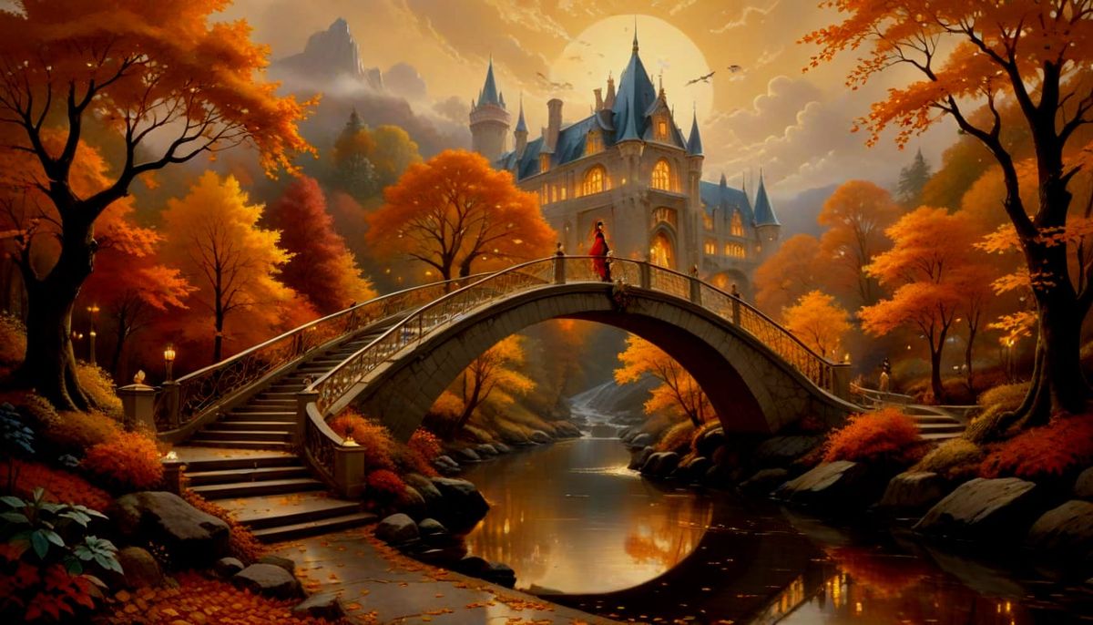 A fantastical autumn realm where golden leaves shimmer like gemstones, forming stairways into the sky. A crystal bridge arches over a glowin...