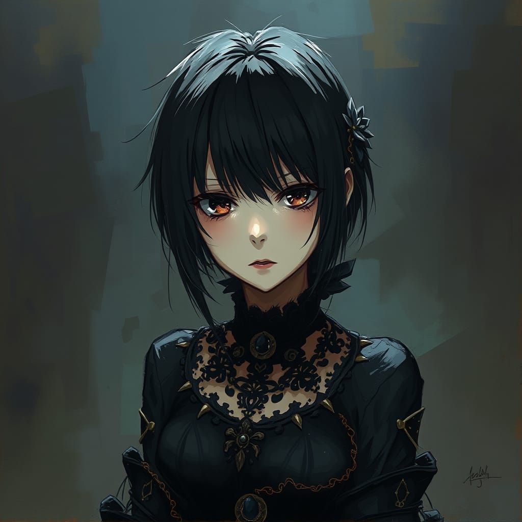 This intense, emotive portrait features a brooding female anime character surrounded by dim, muted tones, with intricate, dark attire and textured brushstrokes reminiscent of neo-expressionist masterpieces.
