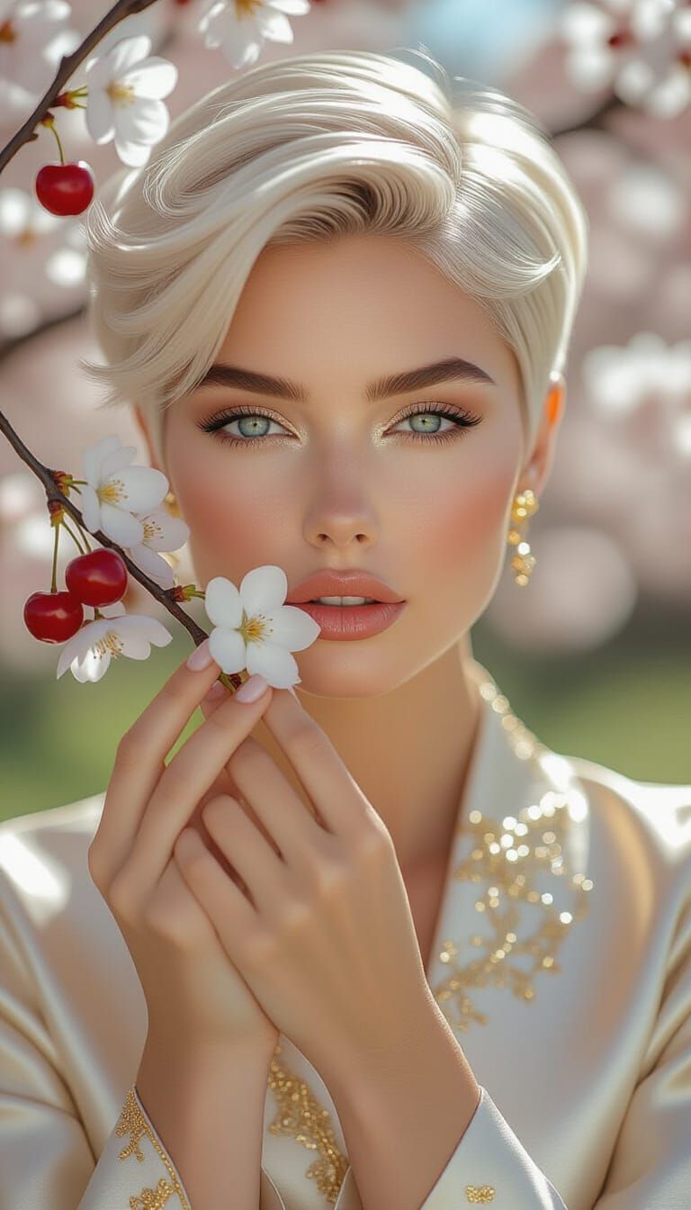 This image shows a beautiful woman with platinum hair and icy blue eyes in a fashion magazine style. She is holding a cherry blossom in a photorealistic style with a soft-focus background.