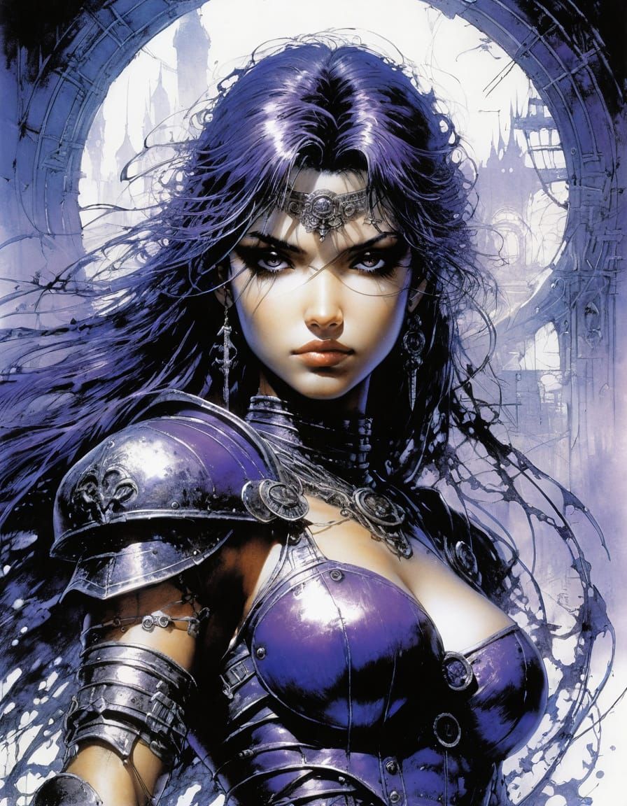 This image shows a striking violet artwork blending elements reminiscent of Royo, Blanchard, Sonoda and Lee. The piece combines fantasy art with impressionistic cityscapes and comic book art styles.