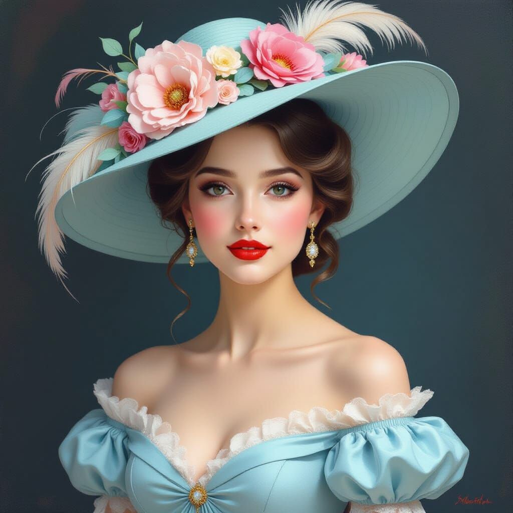 A beautiful young woman with fair skin and red lipstick poses in an antique light blue dress and hat. The image evokes soft, natural watercolor with thick brushstrokes and textured layers.