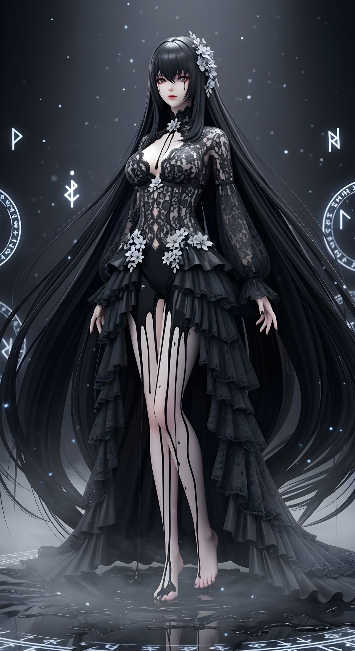 This image shows a gothic woman with pale skin and long black hair. Black liquid drips down her body in this work of 3D anime art with fine aesthetic details.