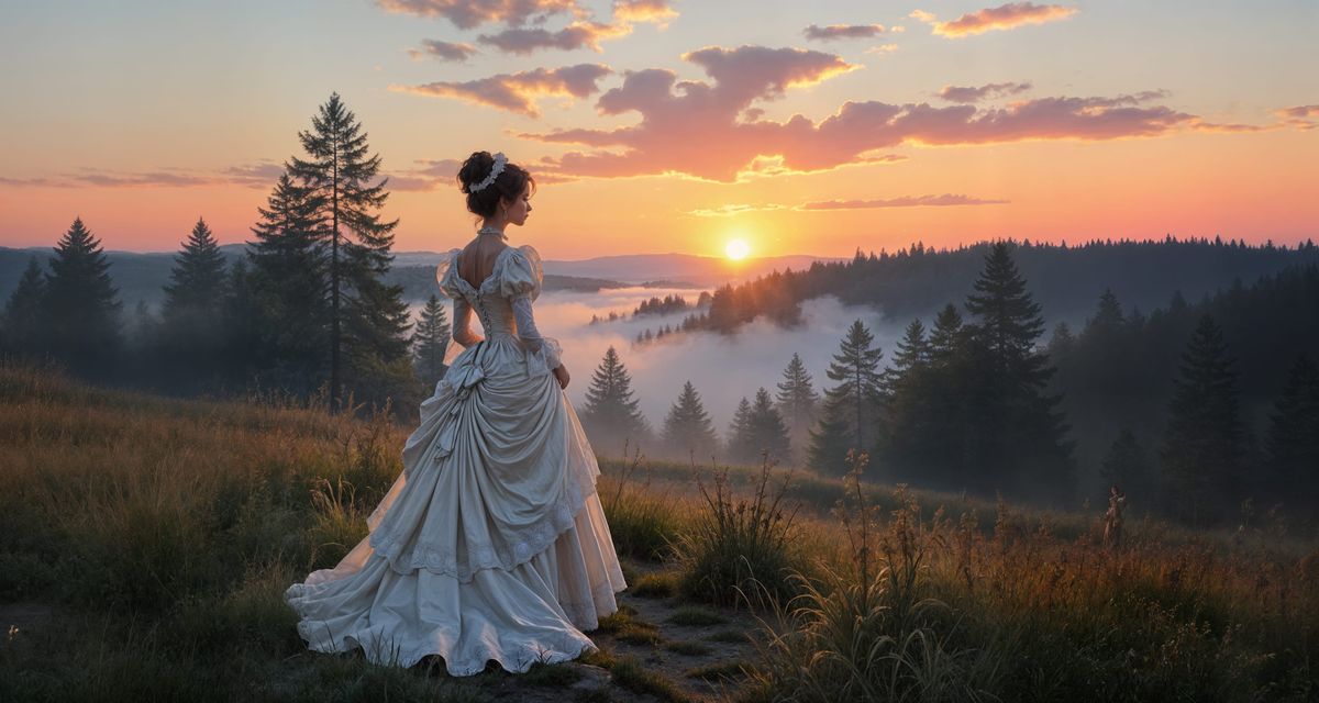 A serene prairie landscape at sunrise, featuring a woman in a Victorian silk dress. The misty morning light illuminates the scene creating a peaceful, painterly atmosphere.