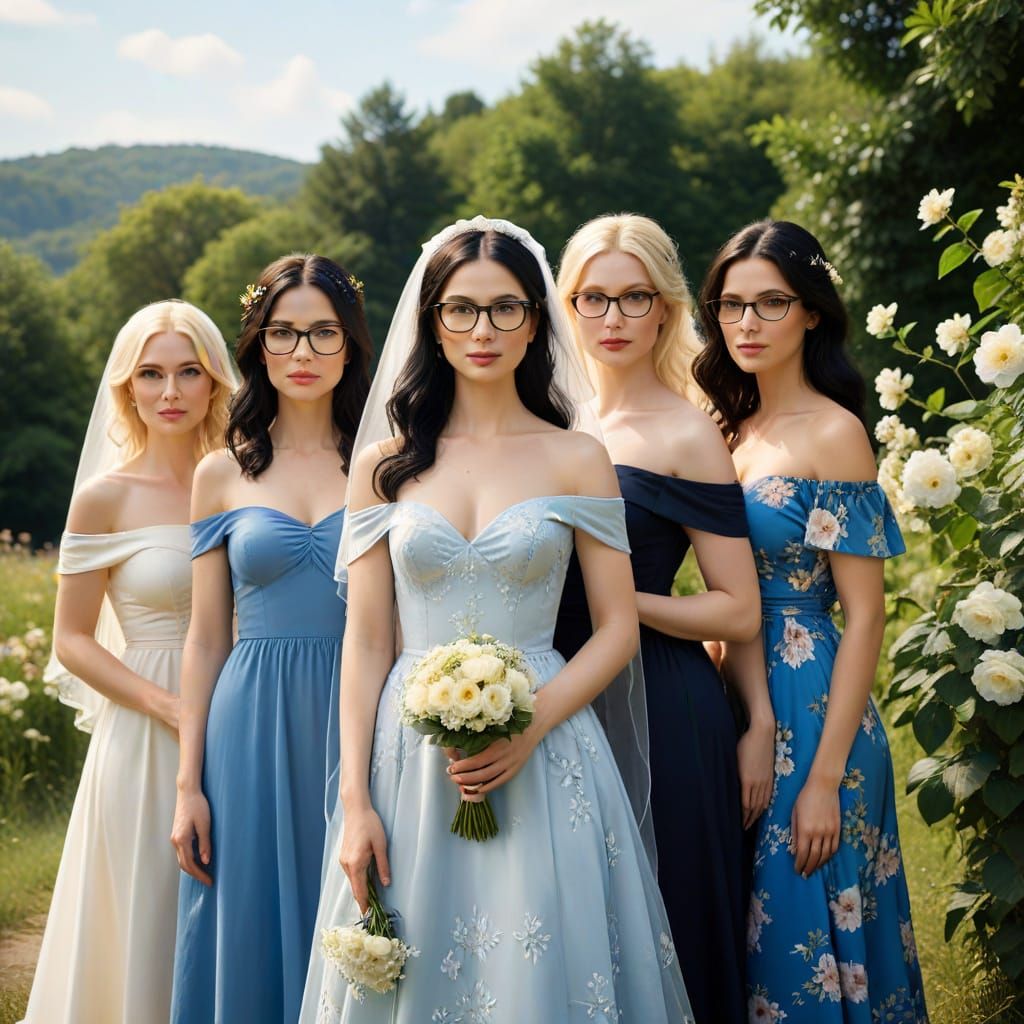 This image showcases portraits of seven women with distinctive features and attire, set against a natural backdrop. The composition emphasizes hyperrealistic photography techniques.