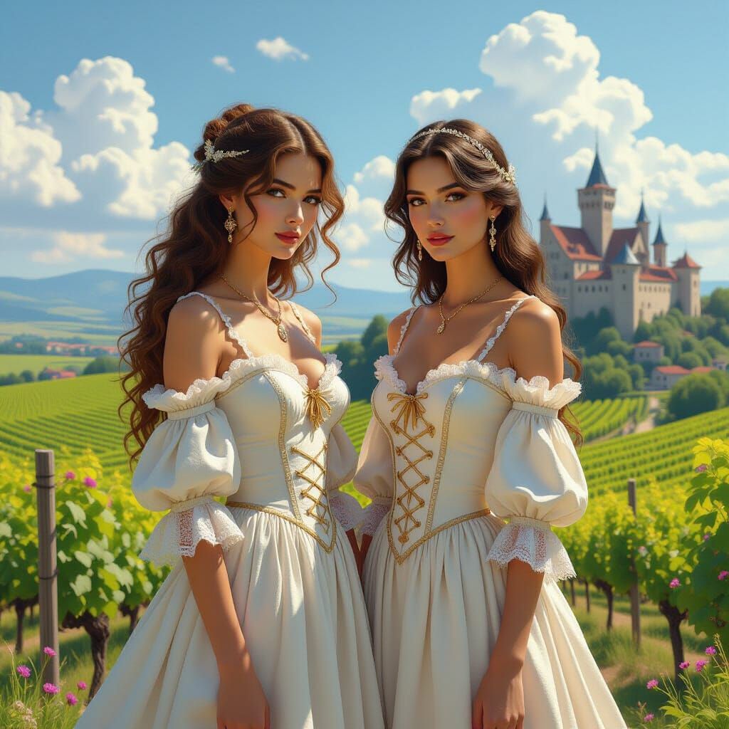 This image shows two women in Renaissance dresses in a vibrant vineyard landscape. A medieval castle rises in the background under a blue sky in this detailed matte painting.