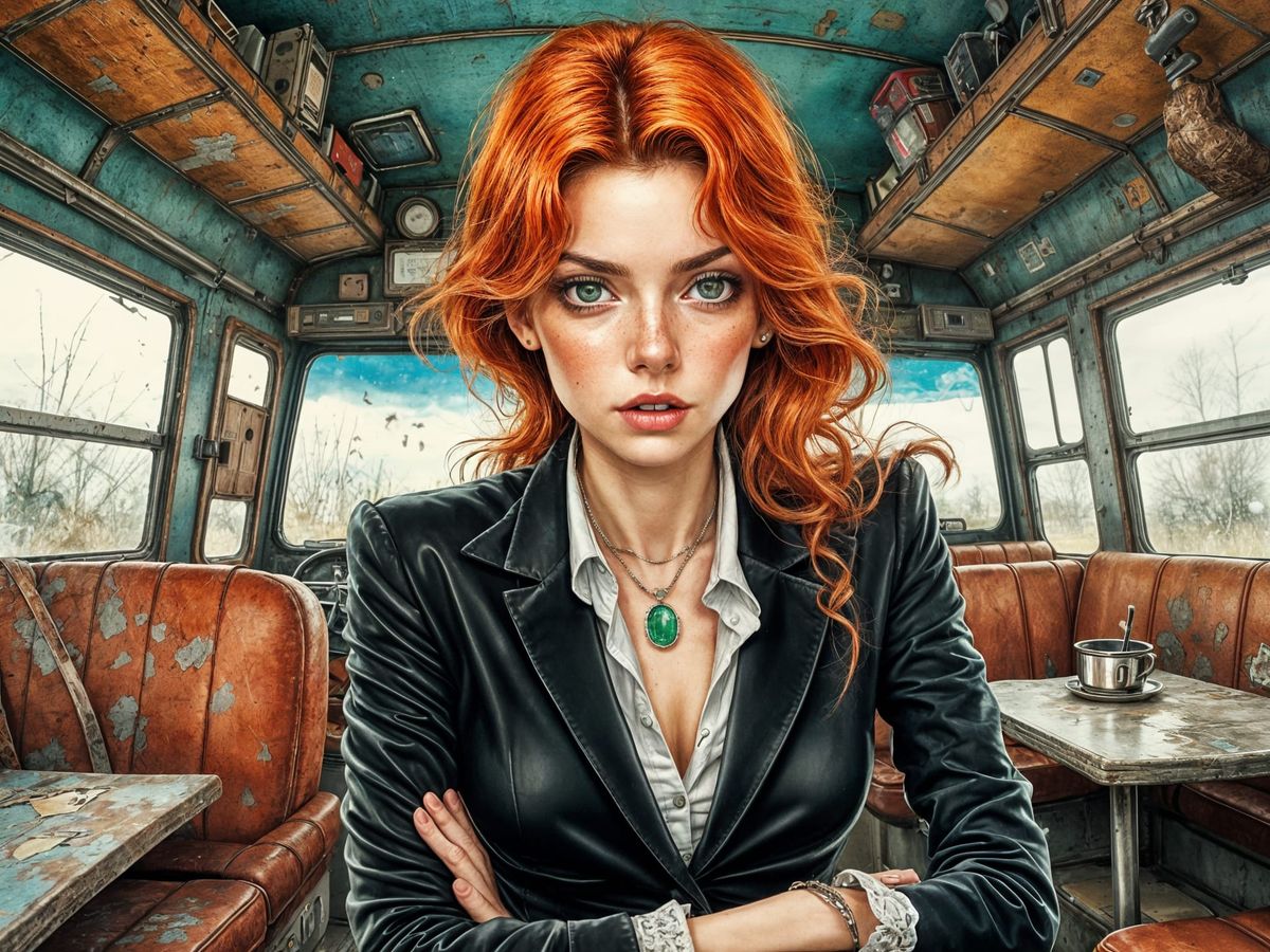 A vibrant, ink-drawn image of a young woman with fiery red hair and piercing green eyes, exasperated by the antics of a rock band in the background. The scene is set on a cluttered tour bus, with worn leather seats and faded posters, as the woman's expression conveys her growing frustration.