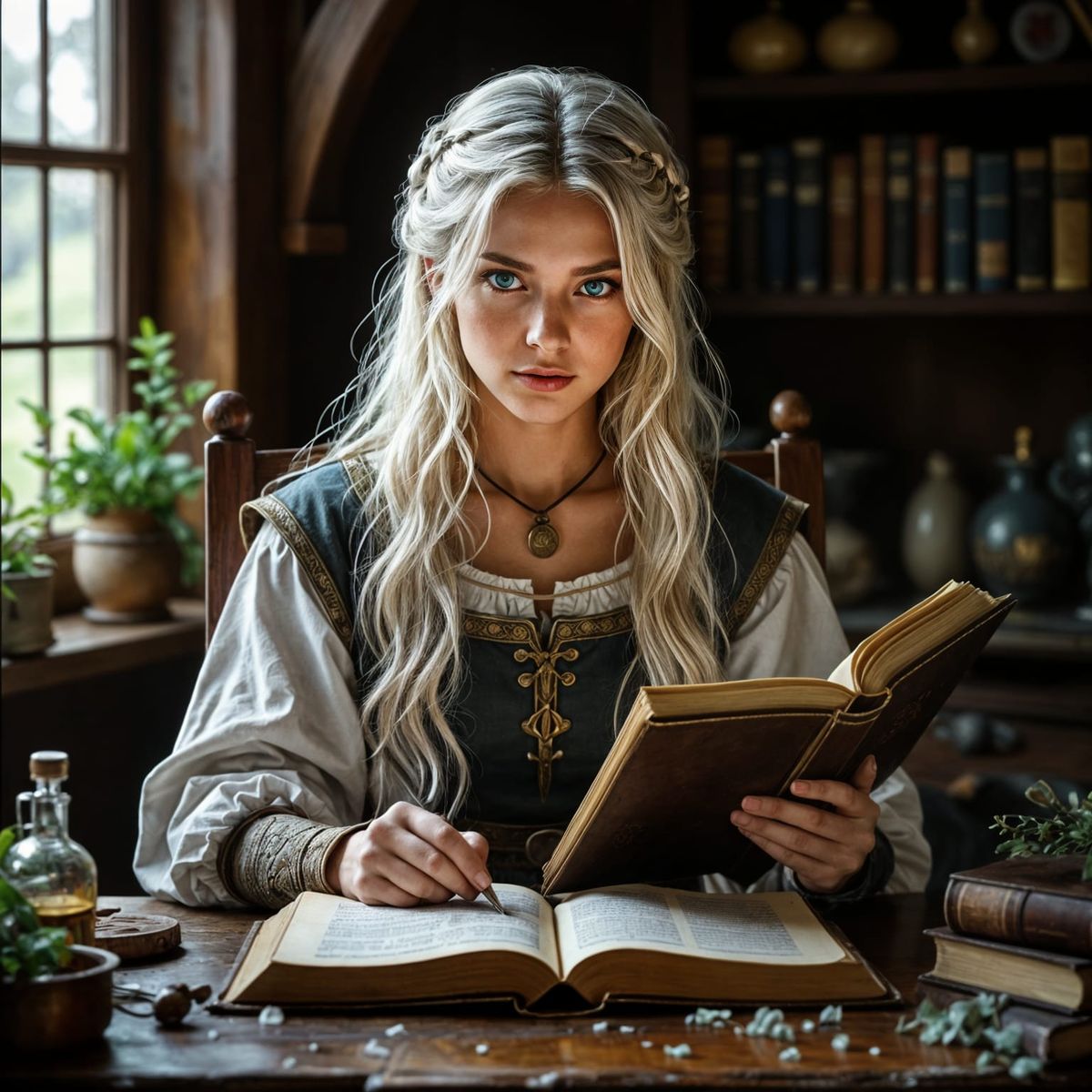 A photorealistic image of a young, white-blonde haired woman in medieval garb studying medicine. The scene depicts a 14-year-old medic engrossed in a book at her desk.