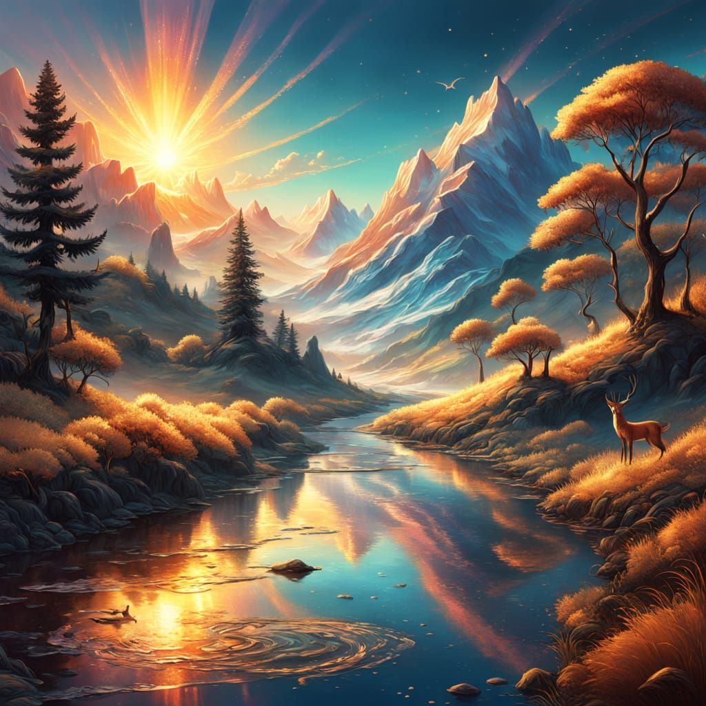 Generate your own stunning gold and silver river scenes with majestic golden animal statues. Free and easy AI image creation.