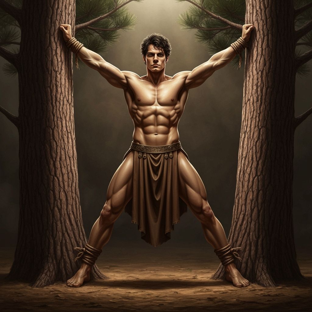 This image shows a muscular ancient Greek hero, Theseus, bound between two pine trees. It features dramatic lighting and a classical, heroic realism style with rich earth tones.