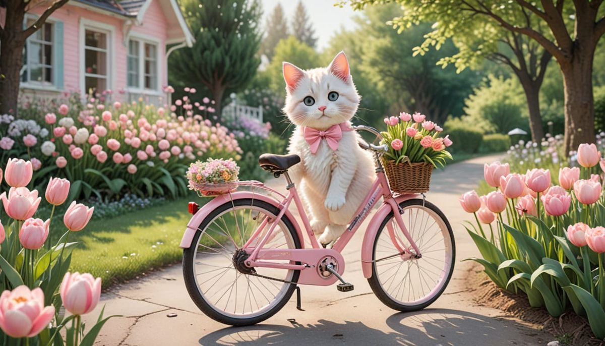 This image shows a cute cartoon kitten riding a pastel pink bicycle with baskets of tulips. The kitten has fluffy white fur and wears a pink dress, rendered in a whimsical watercolor style.