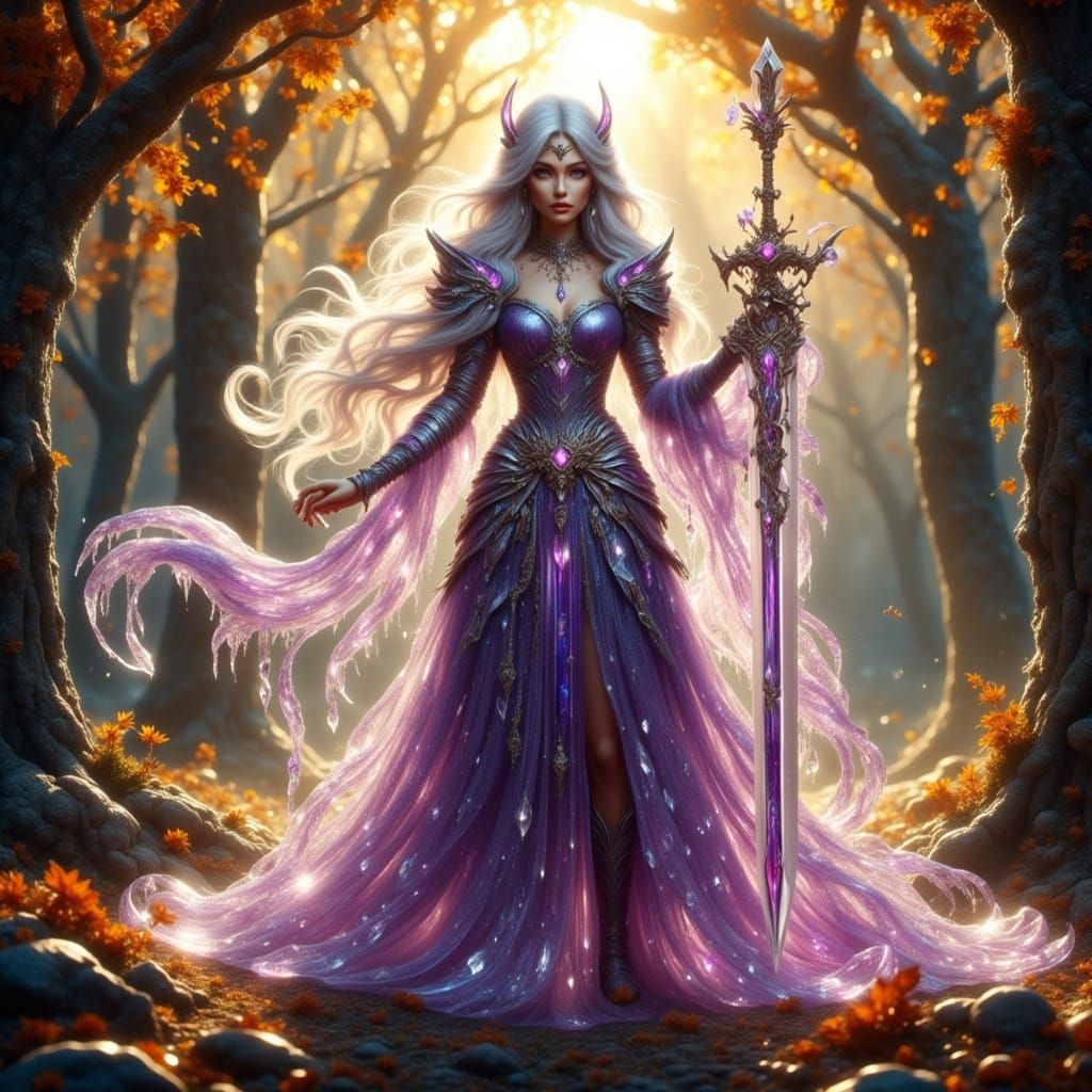 A stunning photorealistic depiction of an elven warrior in a sunlit forest, adorned in transparent violet crystal armor that refracts light. Her sword glows, and mist swirls around her feet in this fantasy masterpiece.