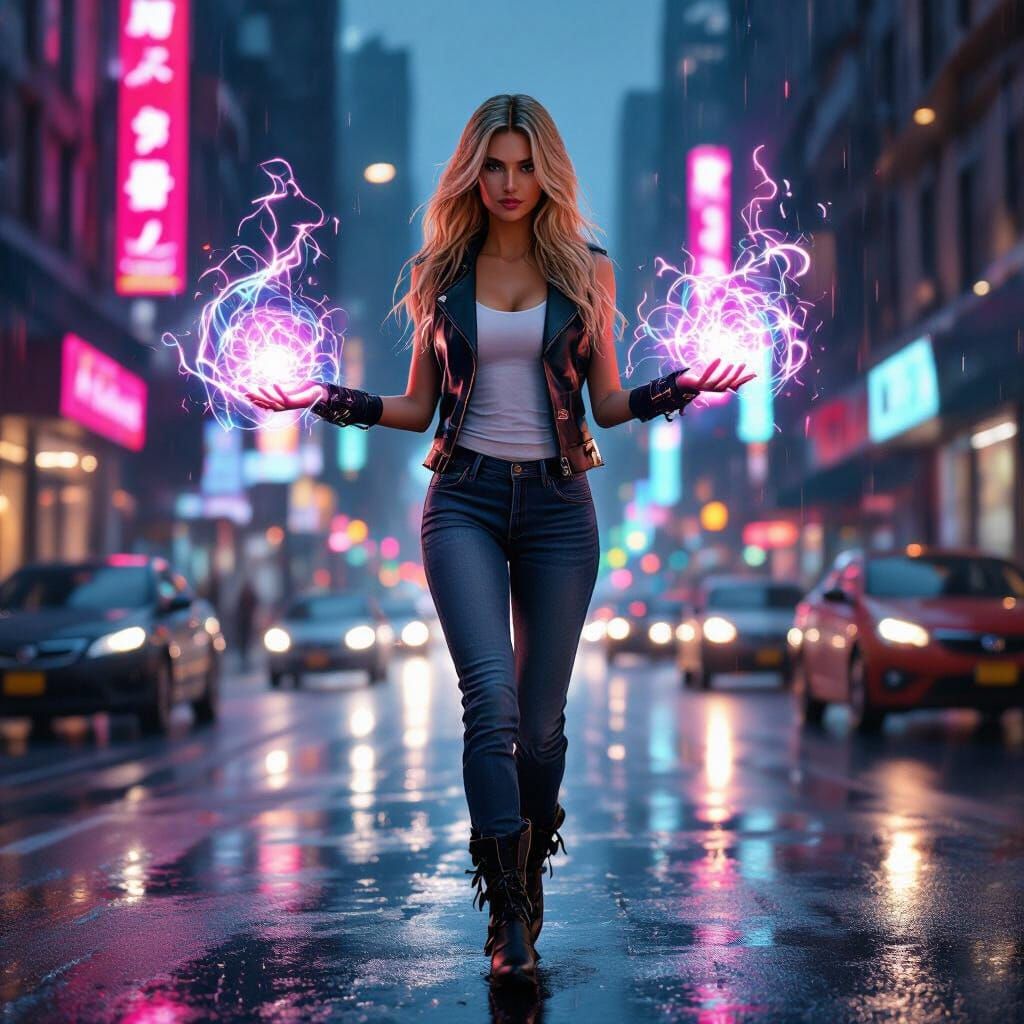 A photorealistic image of a woman with wavy blond hair walking down a wet urban street at night, with magical energy around her hands. Features cinematic lighting and neon city lights.