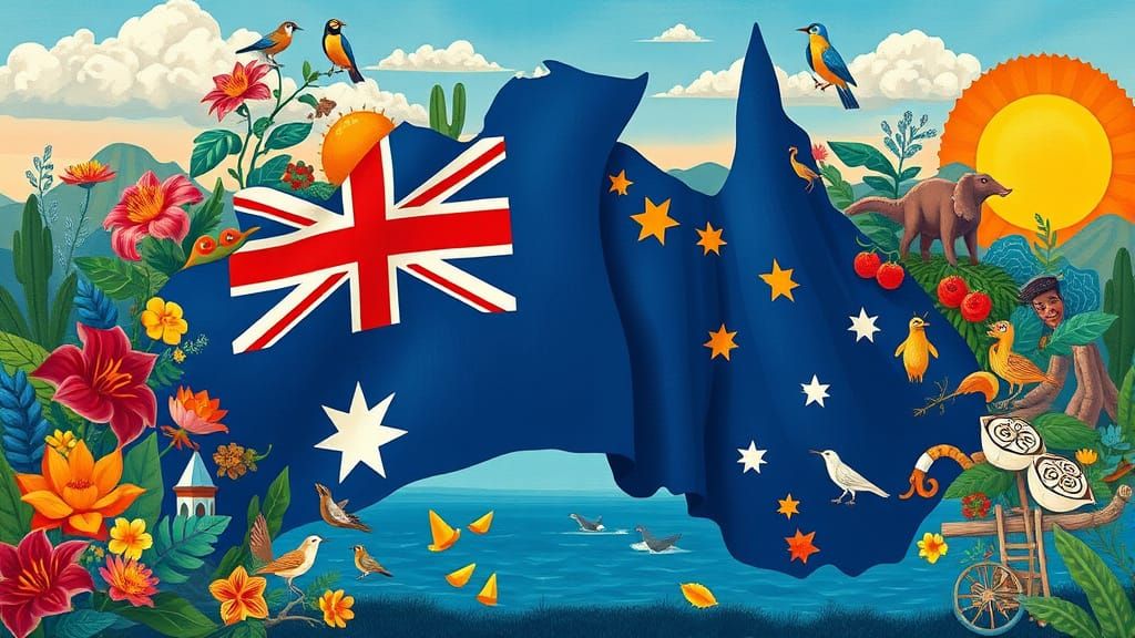 This image shows a vibrant collage of Australian cultural icons. It showcases the flag, food, flora, fauna, landscapes, and history in a bright and whimsical digital illustration.
