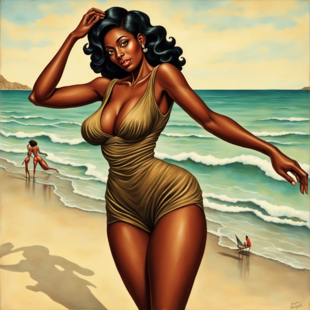 This image showcases a stunning woman with almond-colored skin, long wavy hair, and bold features, set against a soft beach background in a vintage style reminiscent of classic Art Nouveau and elegant portrait photography.