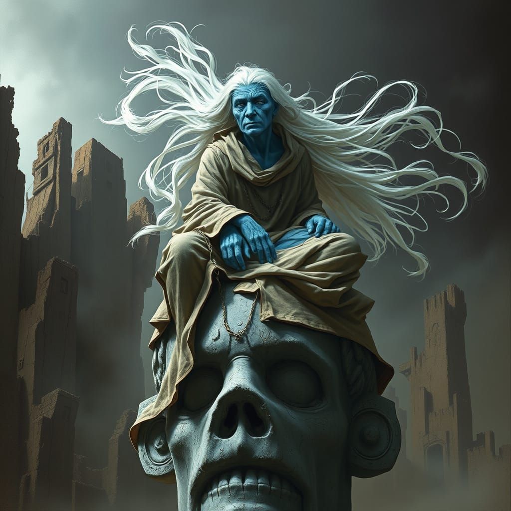 A surreal image of a blue-skinned cyclops with white hair perched atop a broken statue. The scene evokes a sense of mystical realism and industrial decay with atmospheric lighting.