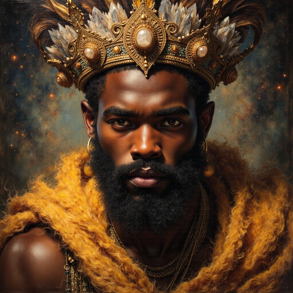 This image shows a regal black male god king with radiant skin and intricate gold adornments. He has a confident gaze against a backdrop of nebulae and galaxies, rendered in a divine oil painting style.