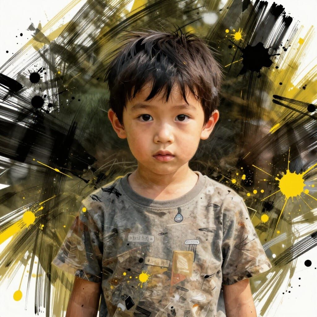 This image depicts a young boy from a children's book, presented as a double exposure photograph with striking black and yellow negative colors and bold brushstrokes.