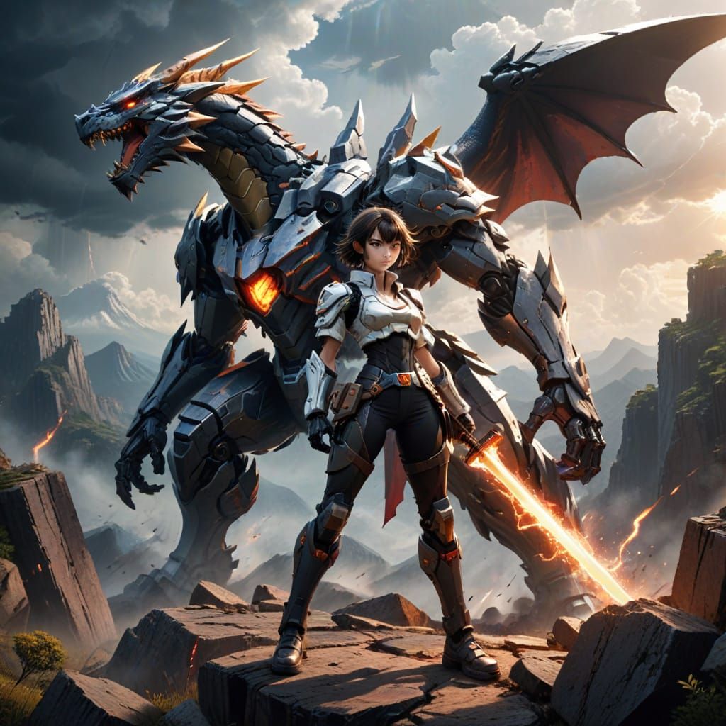 This image shows a fierce female warrior facing off against a massive dragon amidst a dramatic mountainous backdrop. Created in a high-contrast anime style with sharp linework and dynamic angles, the scene is set for an epic confrontation.