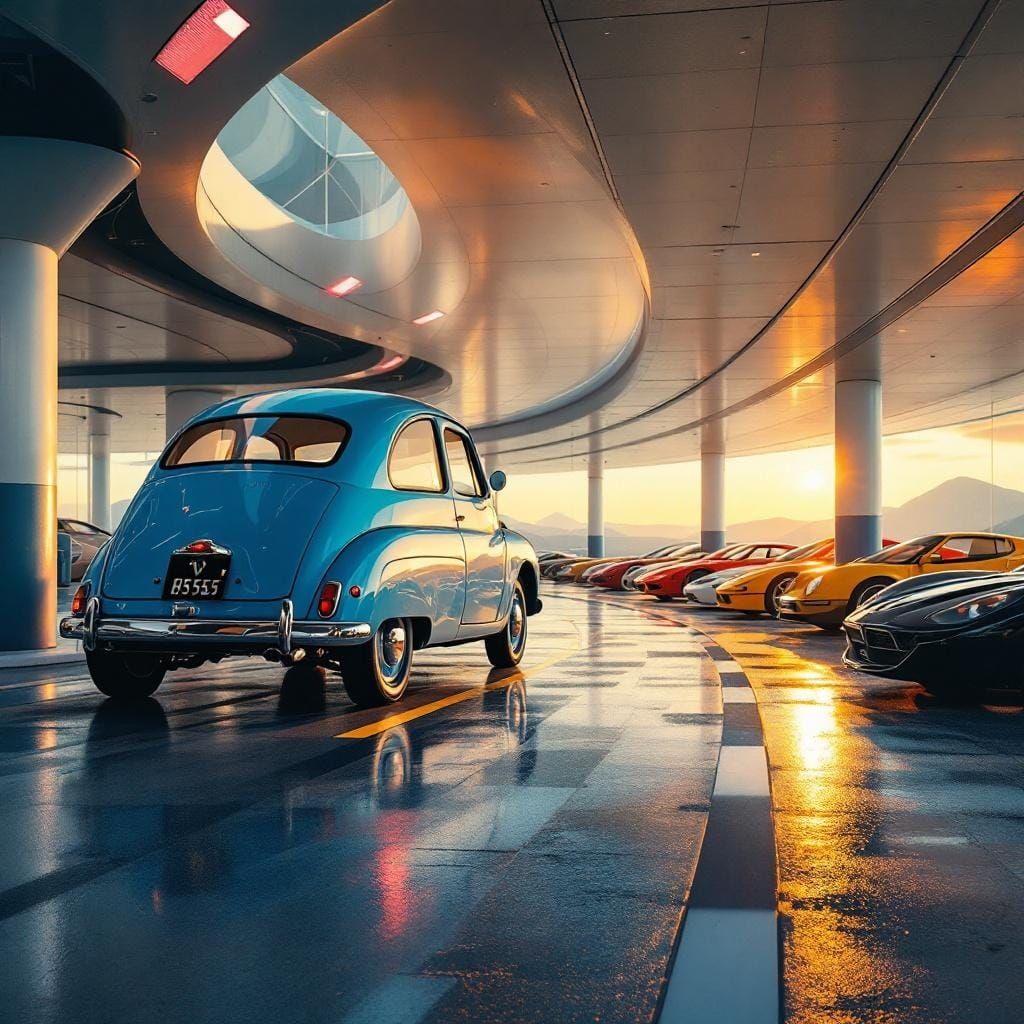 This image shows a sky blue Renault 4 from 1954 parked in a futuristic parking lot filled with 2025-era cars. The picture, in a detailed matte painting style, features hyperrealistic textures and lighting.