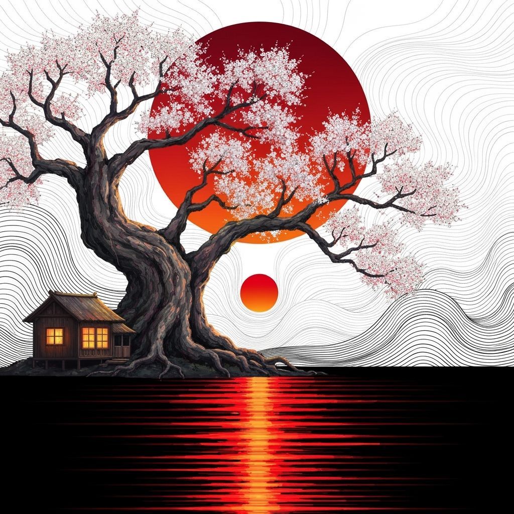 A scenic image of an old tree with white blossoms in front of a vibrant sun. A traditional Japanese cottage sits on the still lake shore, reflecting the sun's light in red and orange hues, as digital art.