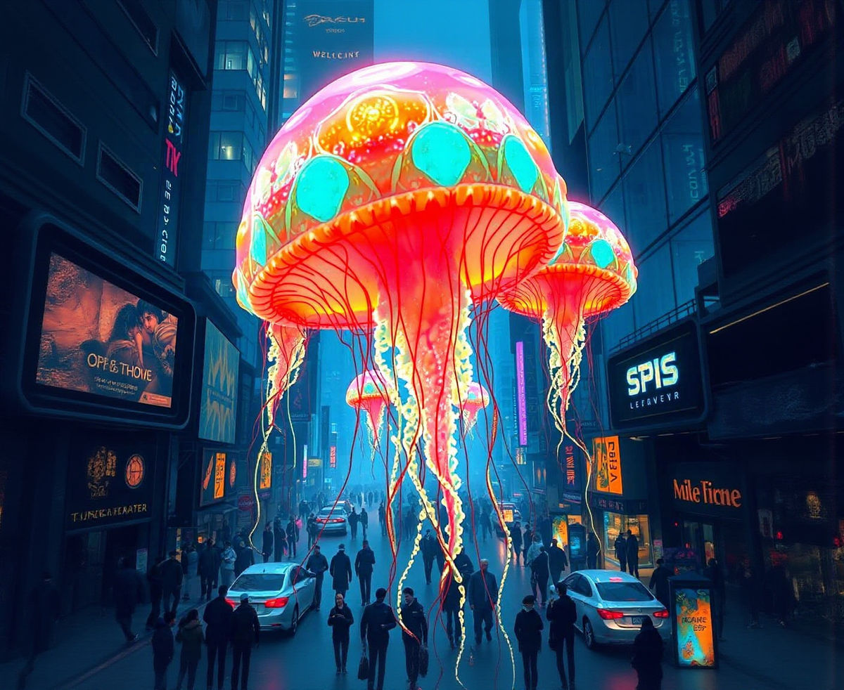 This image shows a glowing jellyfish floating through a futuristic, neon-lit city. The jellyfish illuminates the buildings and streets below, in a cyberpunk aesthetic. Digital art, 8k resolution.