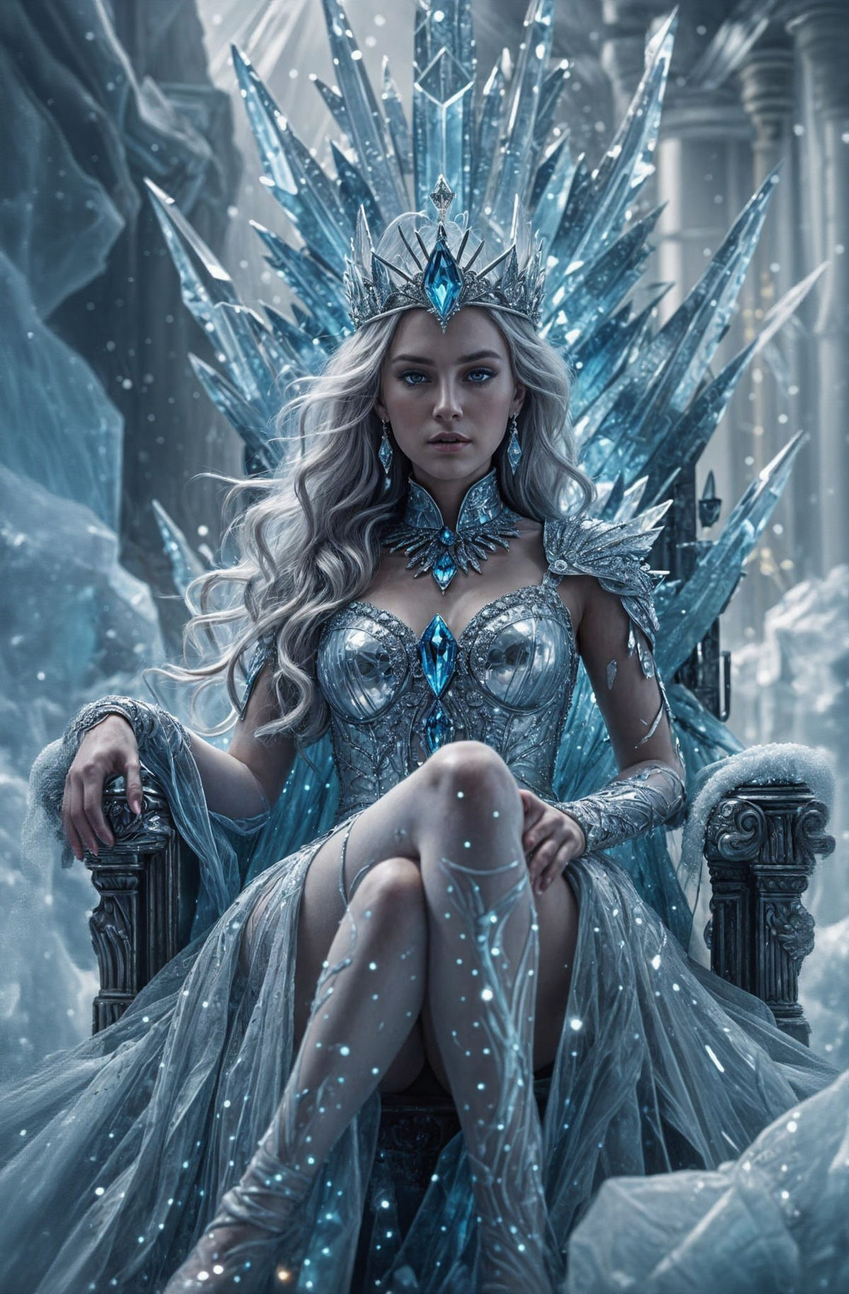 A regal Ice Queen sits on a crystal throne, exuding power and grace. Her long silver hair flows around a radiant ice crown, and her sculpted silver gown shimmers like frozen starlight, adorned with glowing blue gems and metallic details. The throne and backdrop, made of jagged transparent crystals, form ...