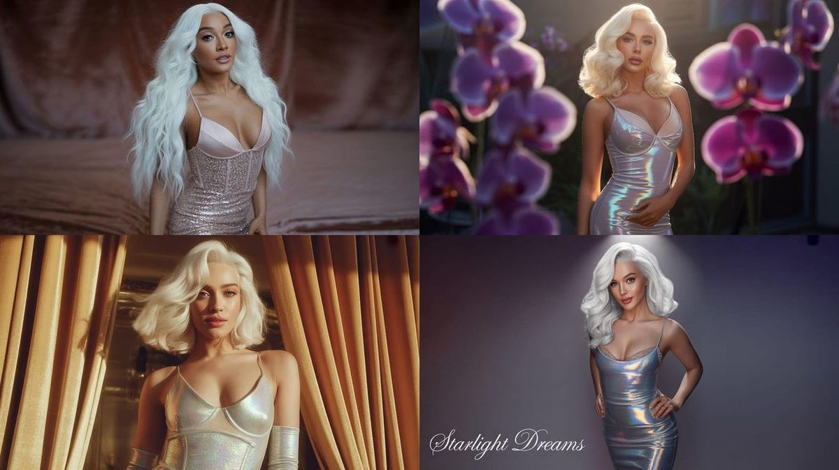 A digital image shows a woman in a shimmering, tight dress that catches the light. She has long, white hair and large eyes. The scene emphasizes the reflective qualities of the dress.