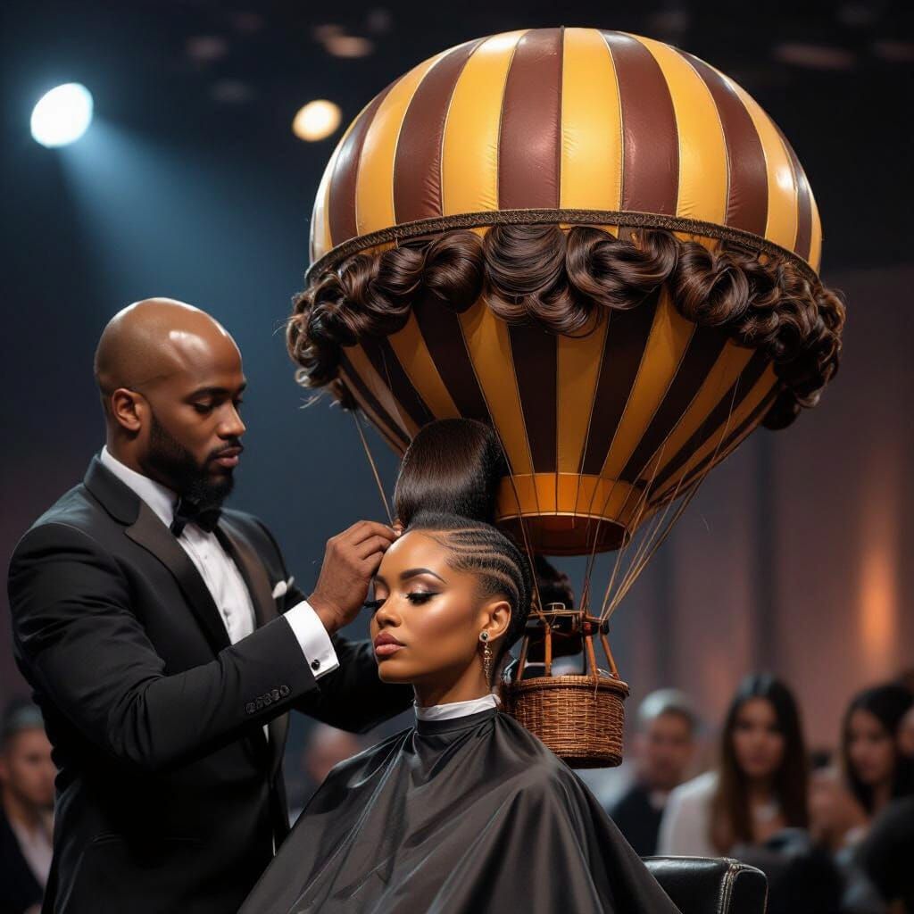 This image shows a stylist at a hair competition crafting a futuristic, avant-garde hot air balloon hairstyle on a Black woman. The balloon blends seamlessly with her hair, securing a win.