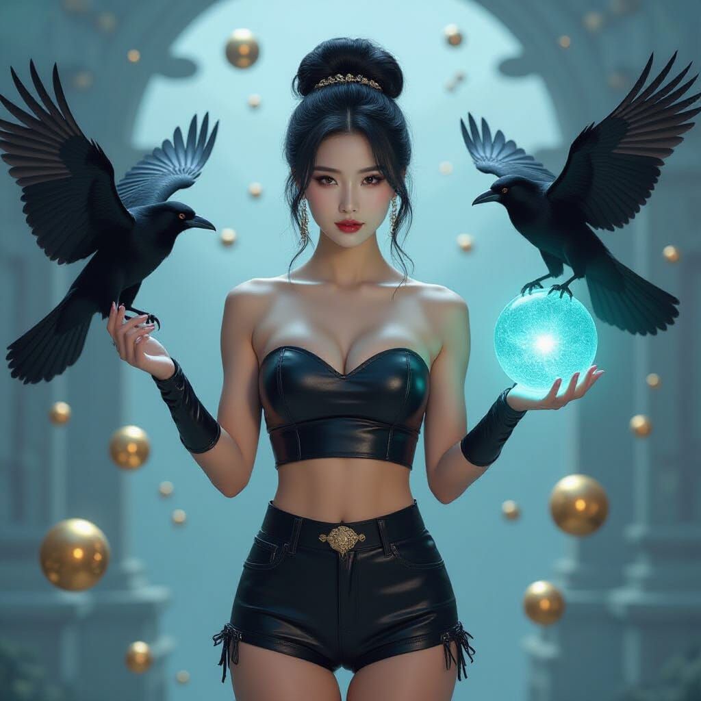 A dramatic fantasy portrait, bathed in a cool, dark-blue hue, showcases a strikingly beautiful Korean woman as the central figure. She wears a meticulously crafted black leather ensemble, consisting of a strapless crop top and high-waisted shorts, her raven-black hair styled into an elaborate Victorian-inspired ...