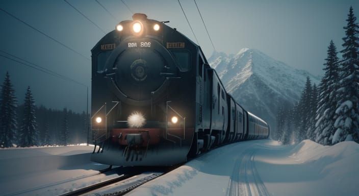 This image shows a dramatic, cinematic film still of a train in a snowy landscape. It features atmospheric lighting and a vintage film aesthetic.