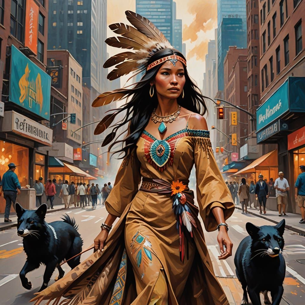 This image depicts a stunning digital painting of Pocahontas in a bustling New York City street, surrounded by towering skyscrapers and vibrant street life, in a style reminiscent of the Old Masters and William Merritt Chase, with bold colors and textured brushstrokes.