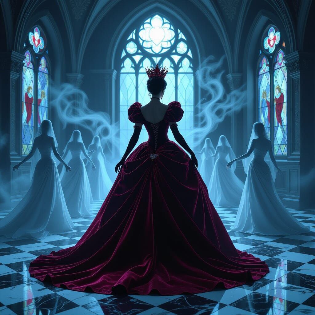 This image depicts a spectral Queen of Hearts in a decaying ballroom, surrounded by ghostly figures. Rendered in dark fantasy concept art style with dramatic lighting and a melancholic palette.